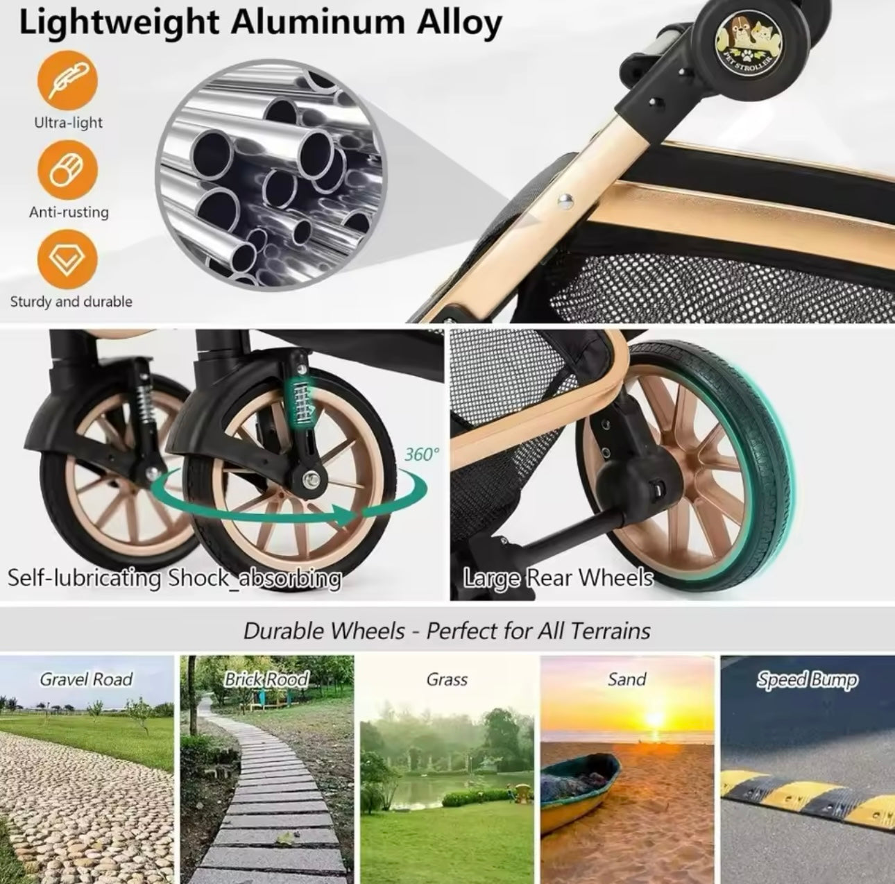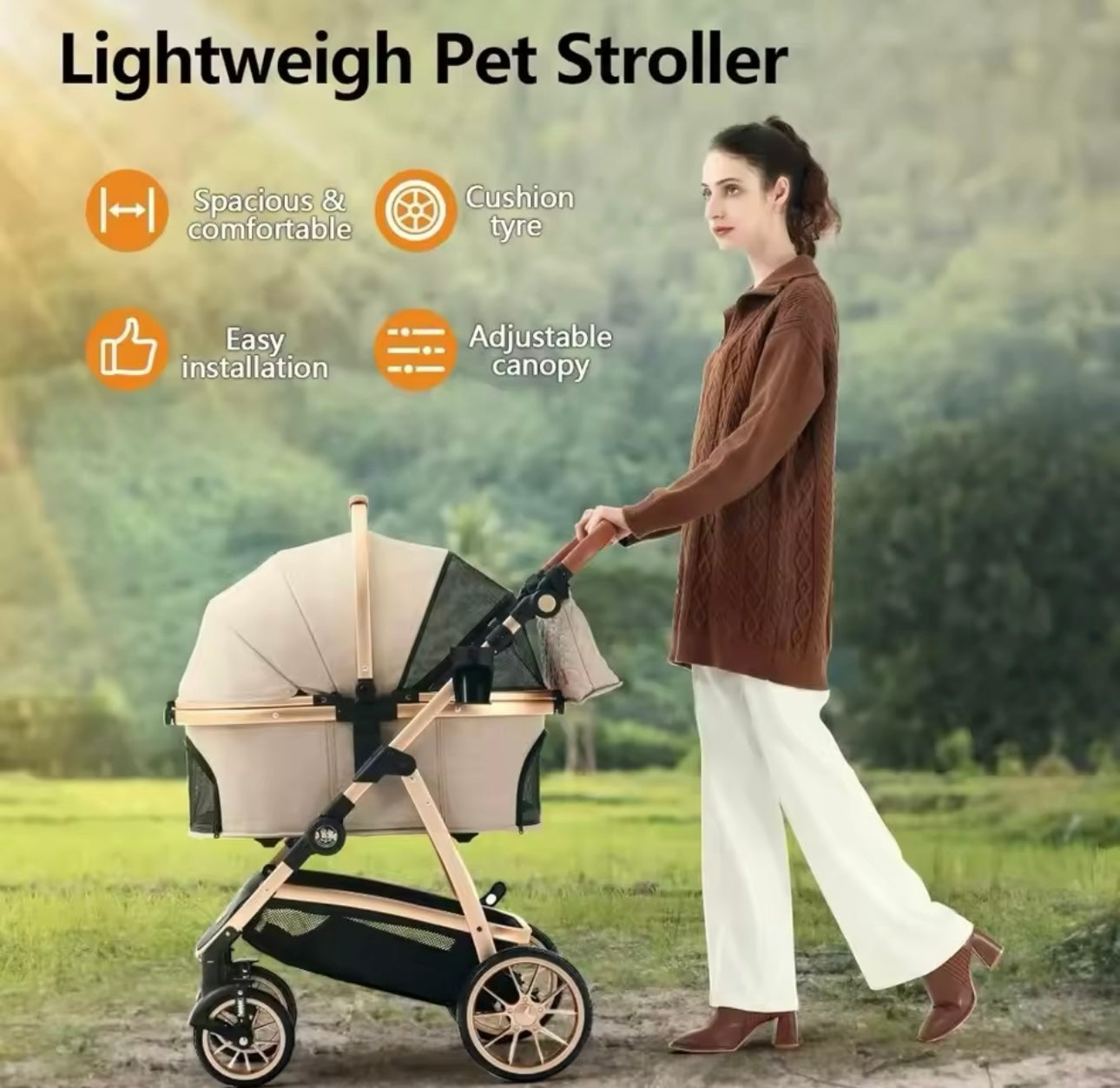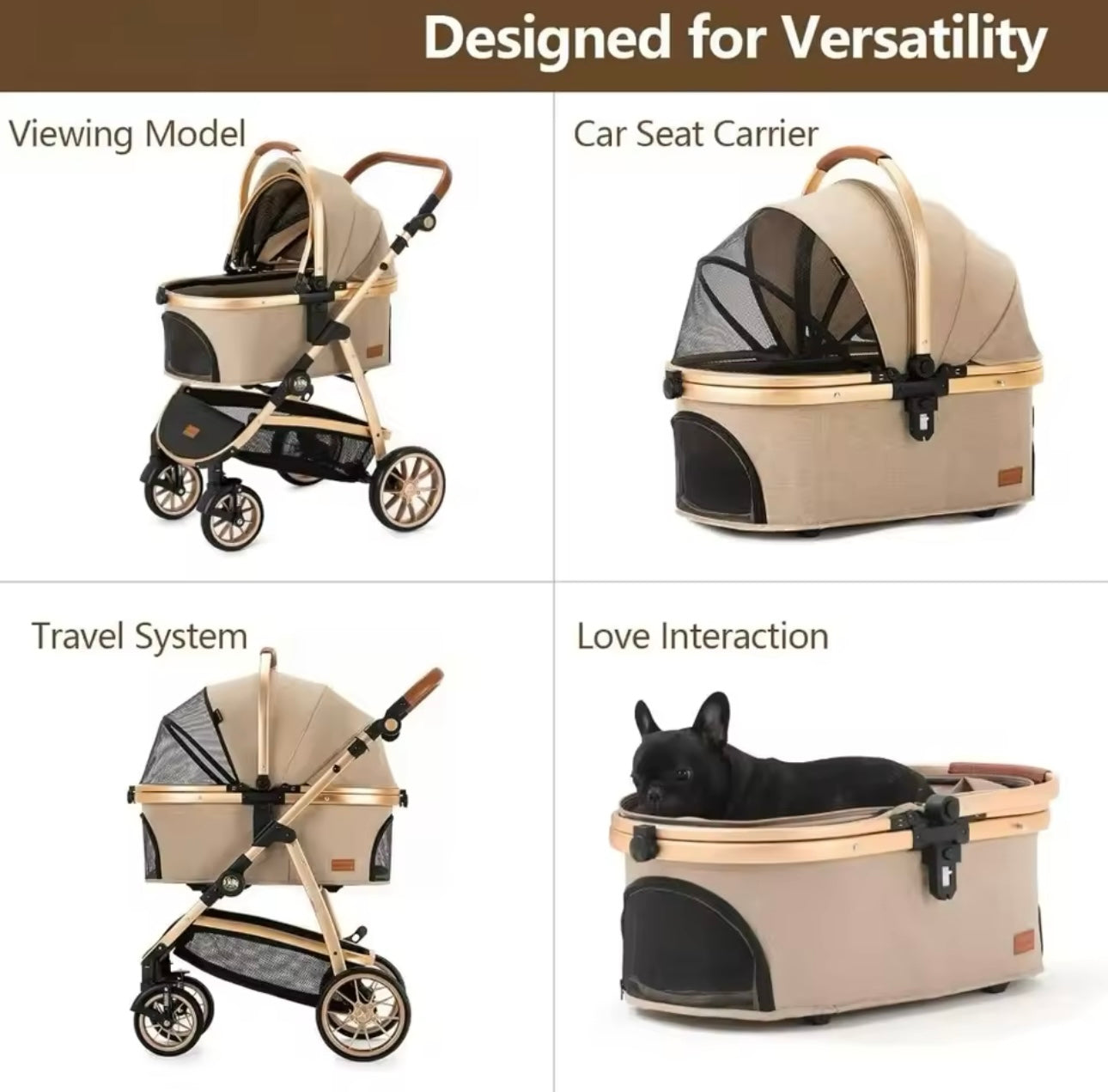 This versatile and stylish pet stroller is designed to offer convenience and comfort for your furry companion. Featuring a luxurious gold trim, it functions as a 3-in-1 carrier, transforming seamlessly into a stroller, travel crate, or car seat. Perfect for medium-sized dogs or cats, it combines functionality with a chic aesthetic.