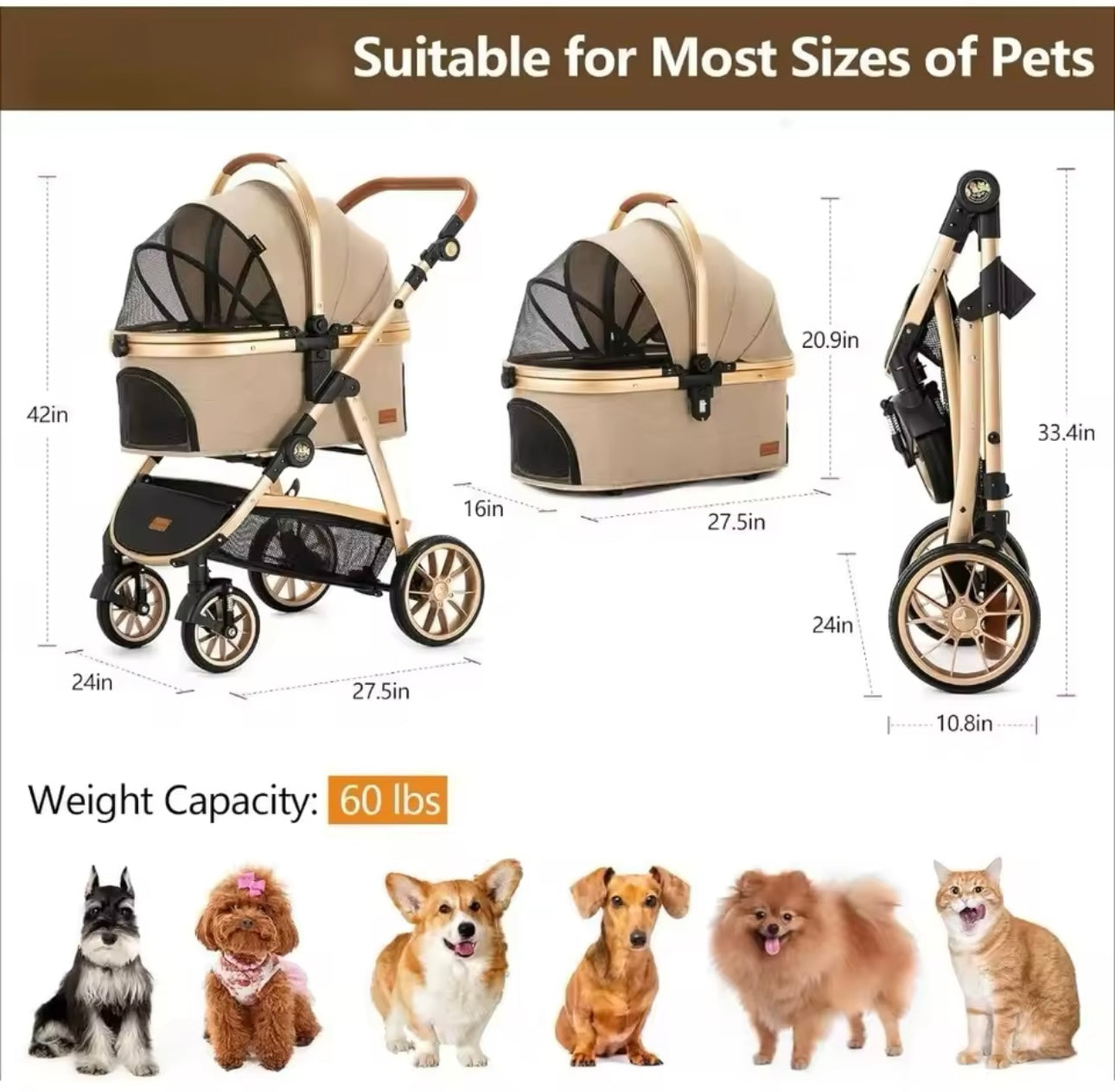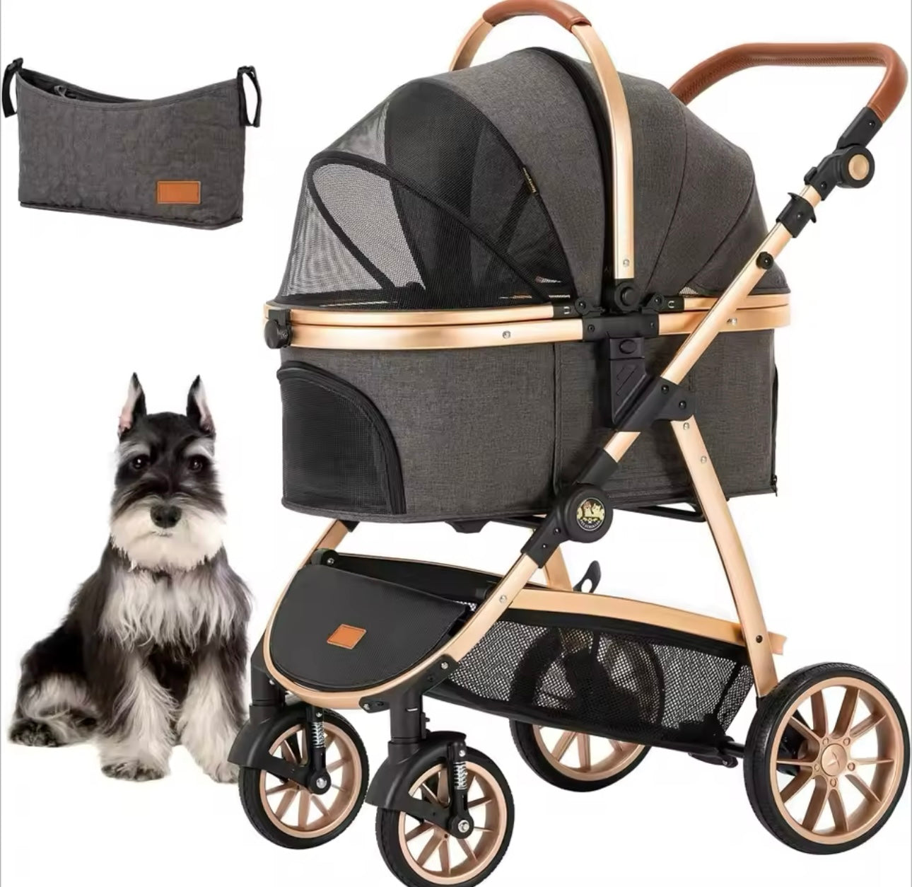 3 in 1 Medium Size Dog or Cat Stroller with Gold Trim