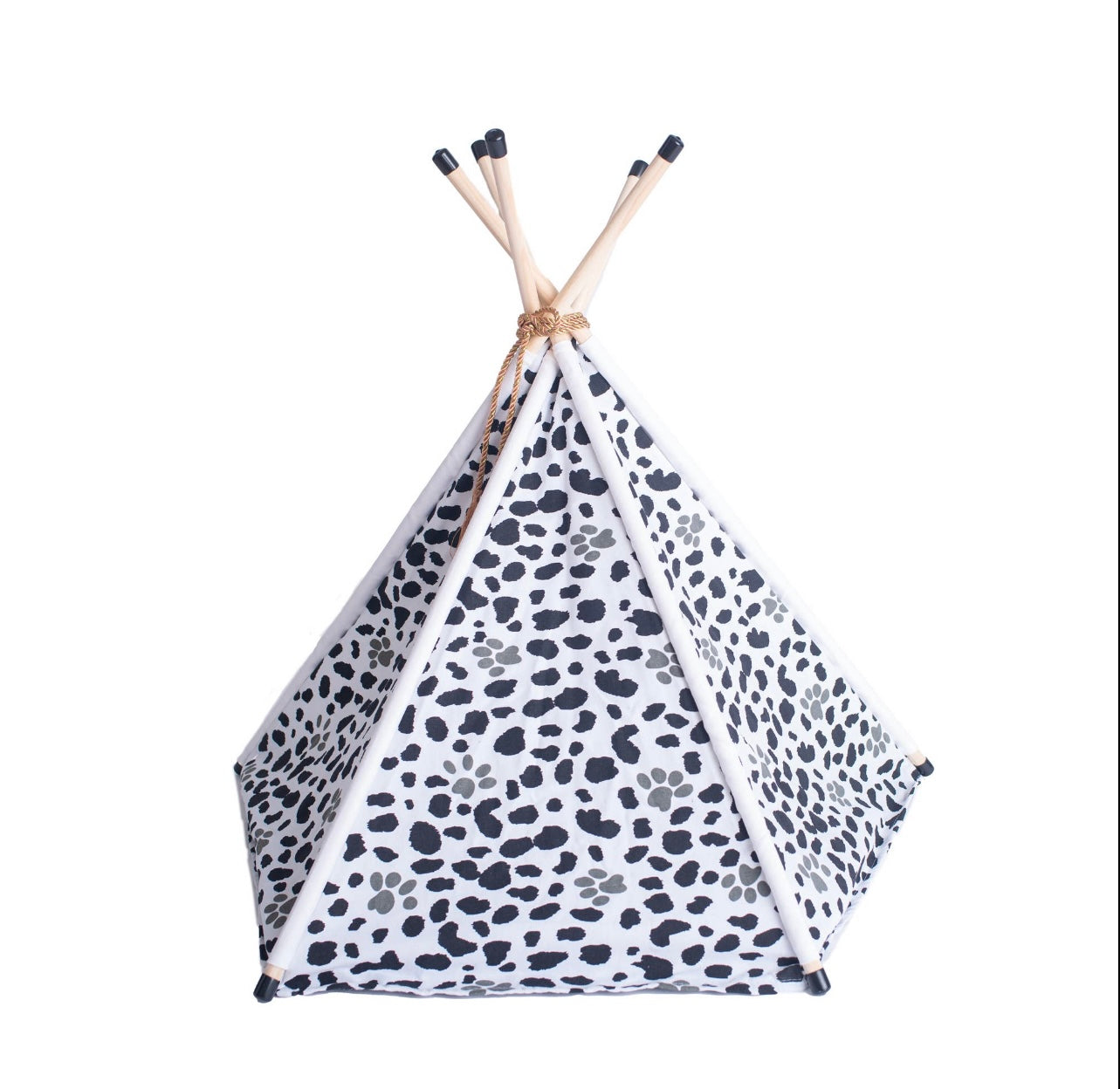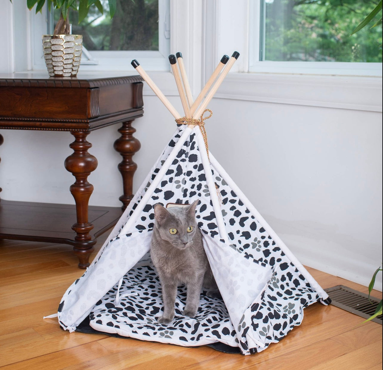 Kitties just love to hide, so you know they will love this teepee tent bed! The heavy duty canvas print is white with black paw prints and the pet bed base is filled with 100% polyfill for maximum comfort. There is rubber capping on both ends of the teepee sticks for safety and stability. Machine washable without the poles.