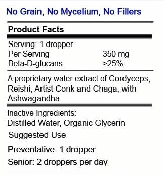 A proprietary water extract of Cordyceps, Reishi, Artist Conk and Chaga, with Ashwagandha.