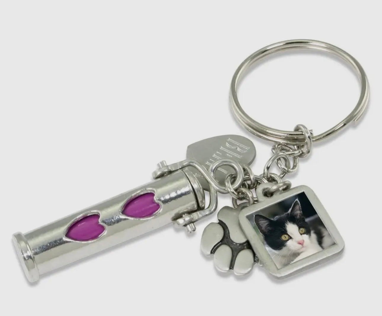 Keep the memory of your beloved furbaby close at heart with this playful design. This key chain urn is perfect keeping a memento of your pet with you at all times. You can have a clear glass vial or choose a colored vial for a more personal touch. Can also be worn as a necklace.