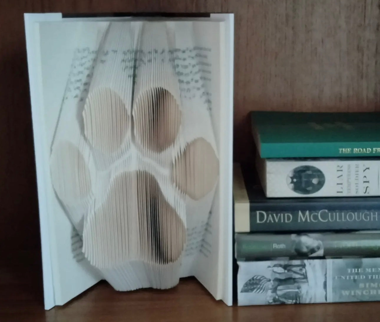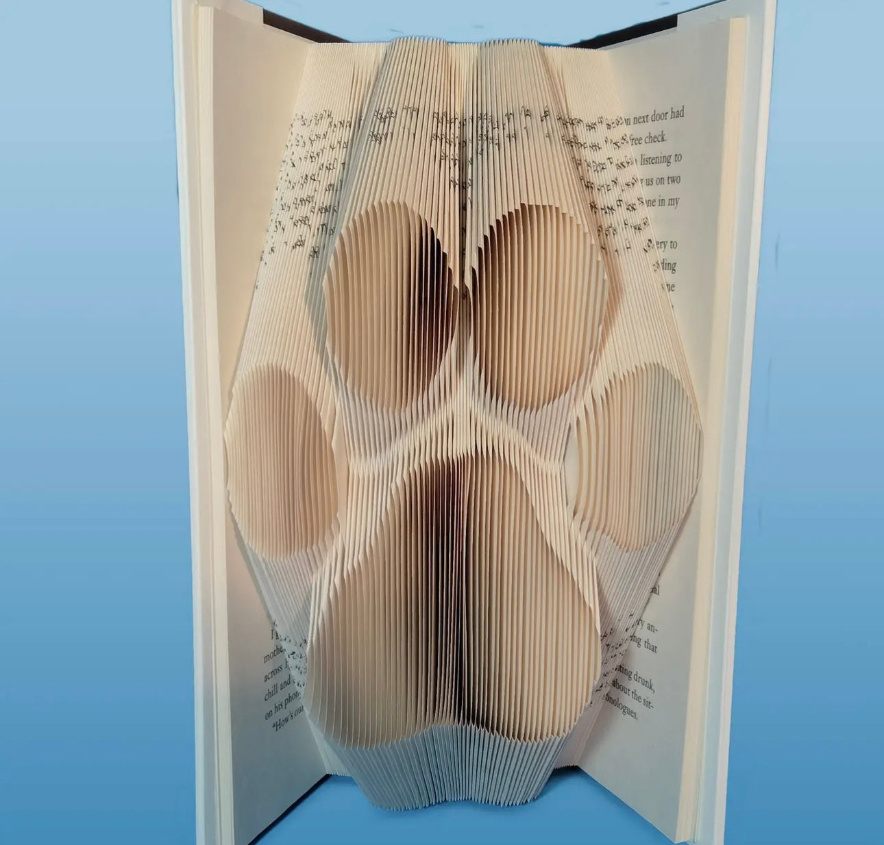 This sculpted paw print book is a unique piece of book art where the pages are carefully folded to create the illusion of a paw print within the books structure. Each individual fold contributes to the depth and shape of the design, allowing the paw print to emerge three-dimensionally when viewed from the books edge.