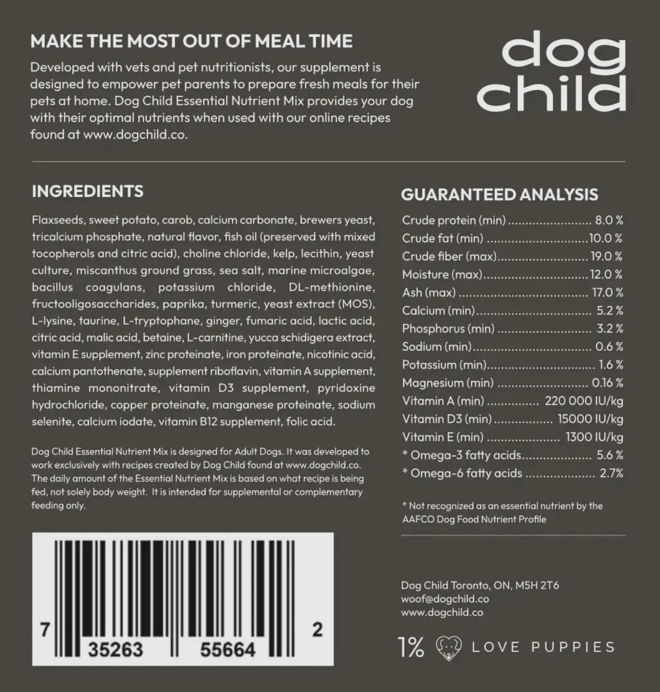Make homemade meals complete with Dog Child Essential Nutrient PreMix for Dogs! Specially formulated with essential vitamins and minerals, this pre-mix is designed to add the nutrients your dog needs for a balanced diet when preparing fresh, homemade meals. Simply combine with your choice of protein, carbs, and veggies to create a nourishing dish tailored to your pup. Free from fillers, artificial additives, and unnecessary ingredients, Dog Child's Nutrient PreMix is an easy way to ensure every meal is as wholesome as it is delicious for your furry friend!