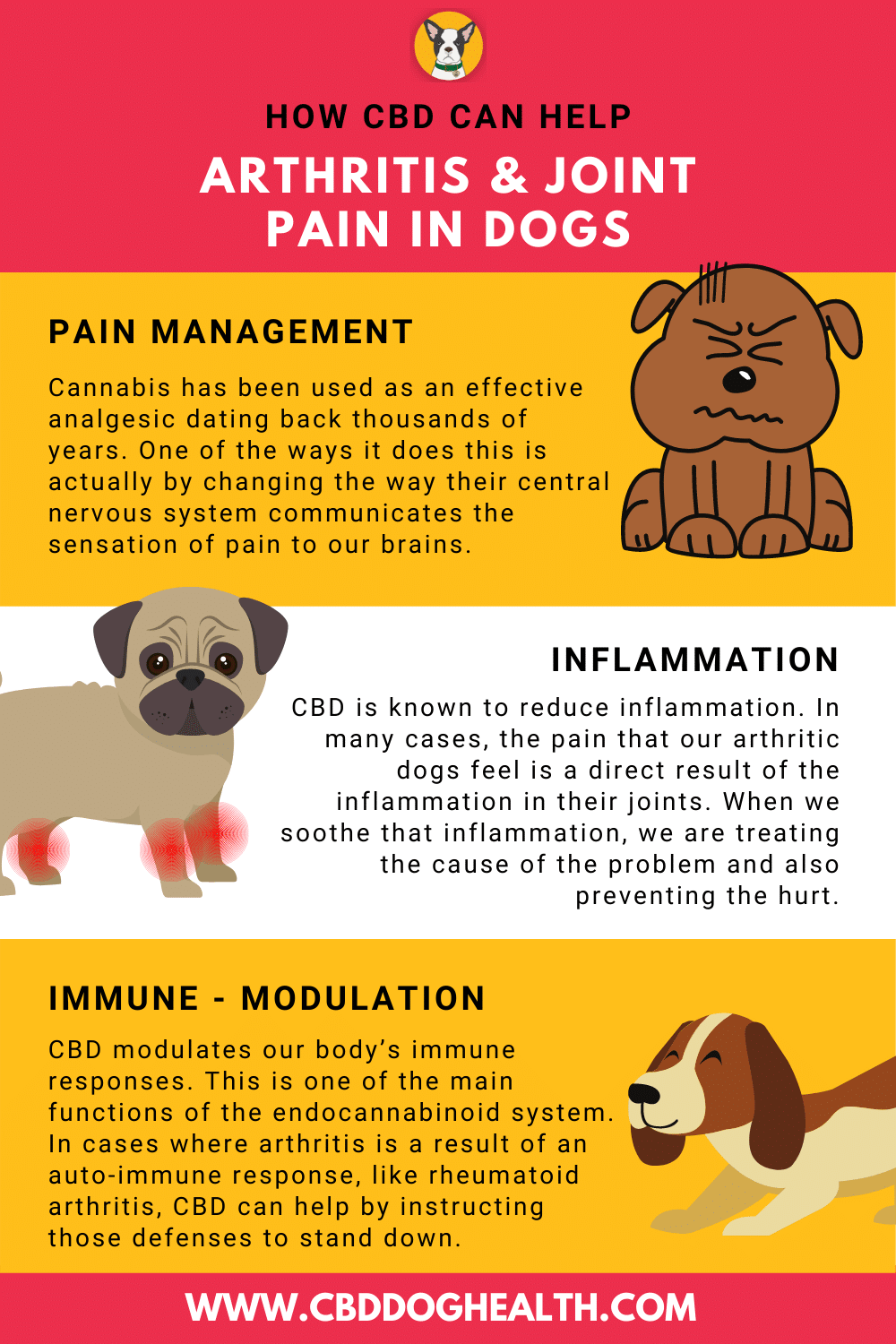 Arthritis - Administer 9 -18mg of CBD for dog pain, this includes dogs with back pain, dog joint pain, and other aches and pains resulting from arthritis. CBD for dog pain can be used situationally or daily. If your dog is still in pain after 10 -15 minutes, administer another 9 -18mg of CBD for dogs pain.