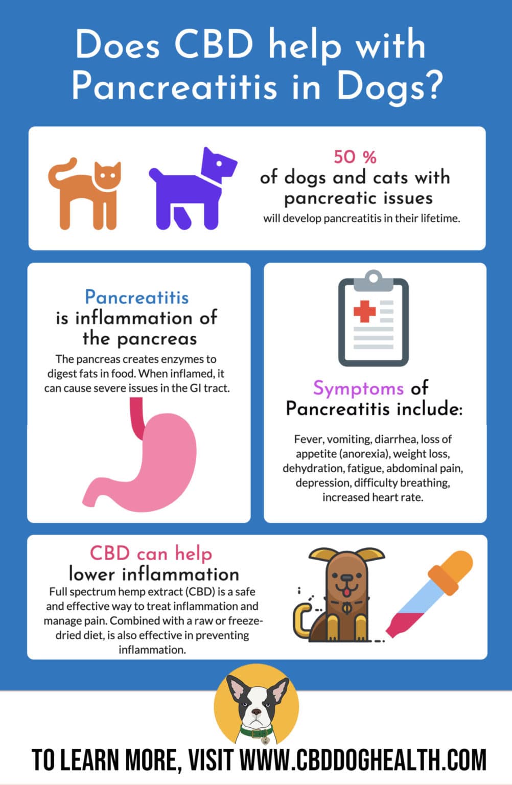Pancreatitis - Administer 9-18mg of CBD for pancreatitis in dogs. Adjust as needed. Full spectrum hemp extract can also help relieve nausea and GI pain associated with pancreatitis. CBD is also helpful in regaining a pet’s appetite.