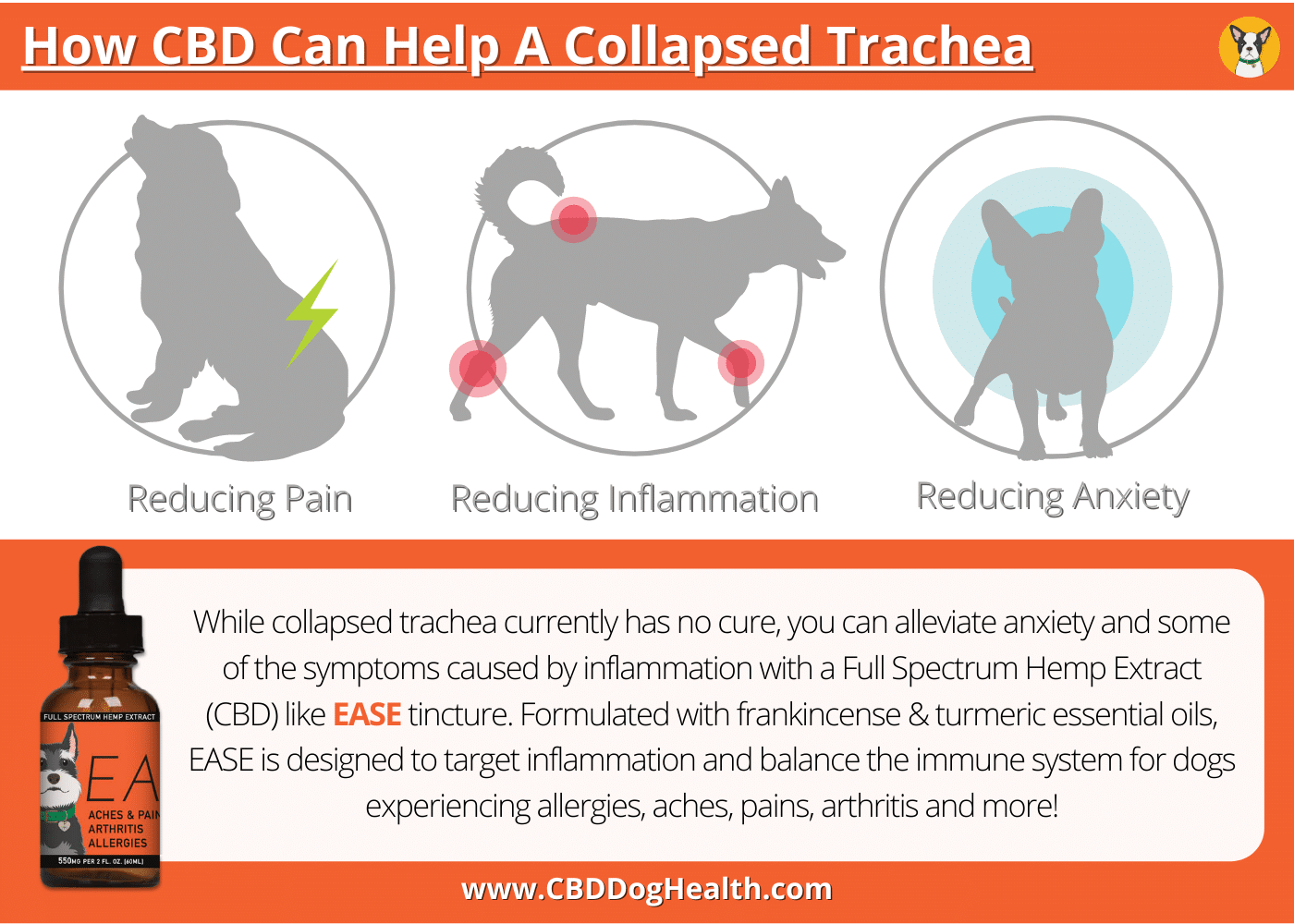 Collapsed Trachea - Administer 9-18mg of CBD for collapsed trachea in dogs and as a natural anti inflammatory for dogs, daily. Adjust as needed. Feel free to administer as needed to help coughing fits.