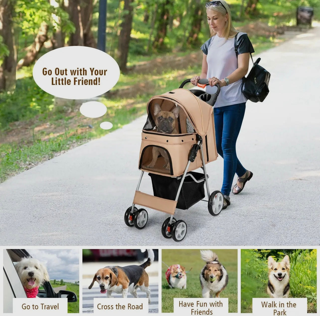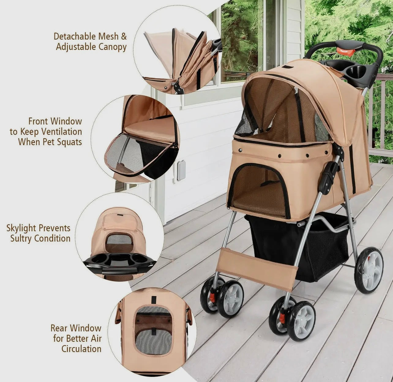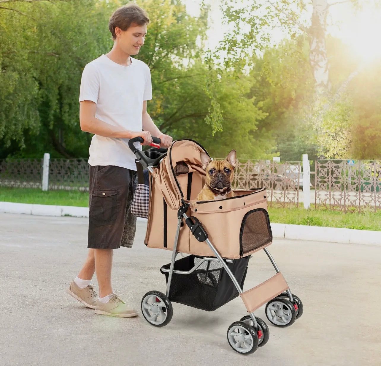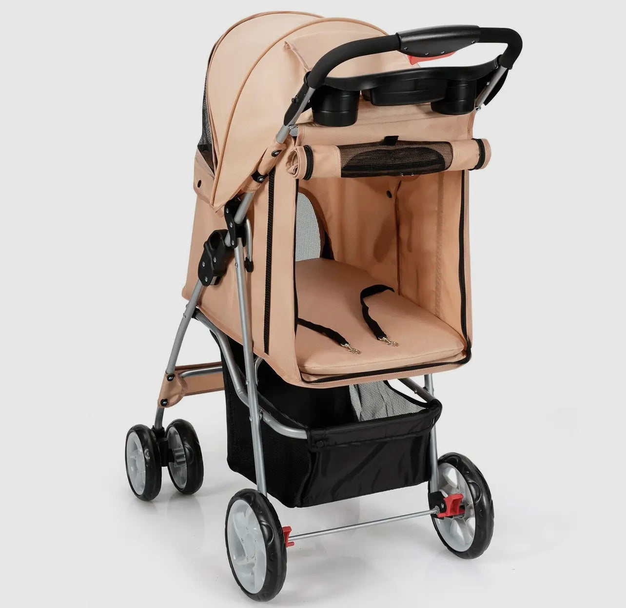 The attached storage basket offers ample space to carry essentials such as pet toys, treats, water bottles, and personal items, ensuring you have everything you need for your outing. The stroller features sturdy wheels for smooth maneuverability and mesh windows for ventilation and visibility. Whether you're taking a stroll through the neighborhood, visiting the park, or running errands, this pet stroller combines practicality with comfort, ensuring a pleasant experience for both you and your pet.