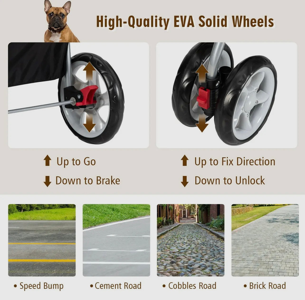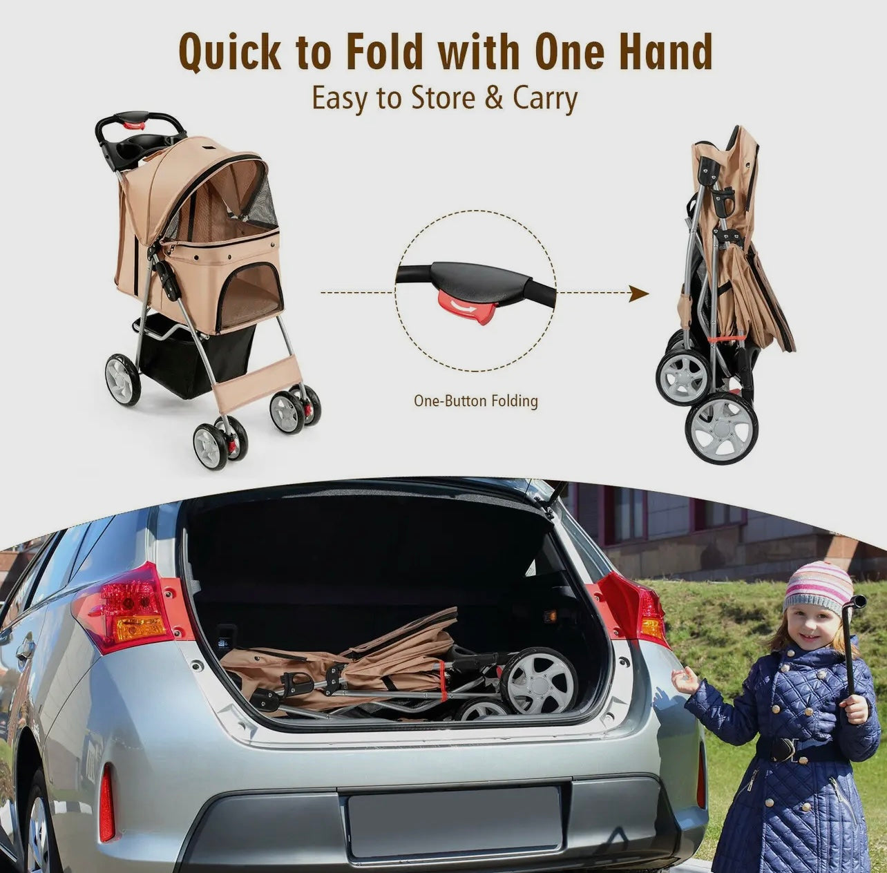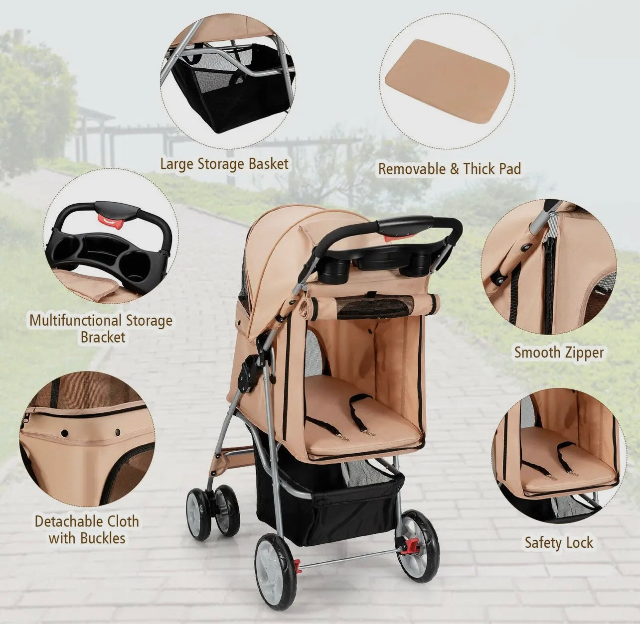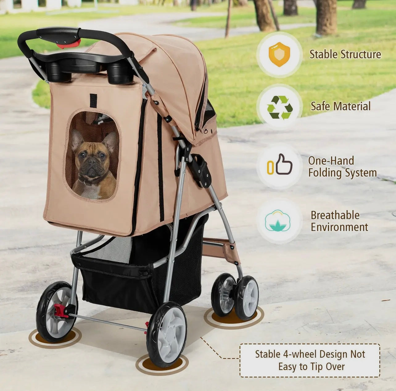 The attached storage basket offers ample space to carry essentials such as pet toys, treats, water bottles, and personal items, ensuring you have everything you need for your outing. The stroller features sturdy wheels for smooth maneuverability and mesh windows for ventilation and visibility. Whether you're taking a stroll through the neighborhood, visiting the park, or running errands, this pet stroller combines practicality with comfort, ensuring a pleasant experience for both you and your pet.