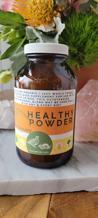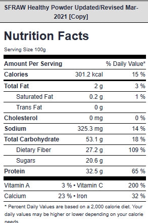 INGREDIENTS: Organic Raw Carob Powder; Grass-Fed/Finished Bovine Gelatin; Organic Psyllium Husk Powder; Organic Kelp, Organic Dulse, Organic Spirulina; Organic, Raw Whole Superfruit Blend (source of Vitamin C): Organic Rosehips, Organic Amla, Organic Camu Camu, Organic Acerola Cherry.