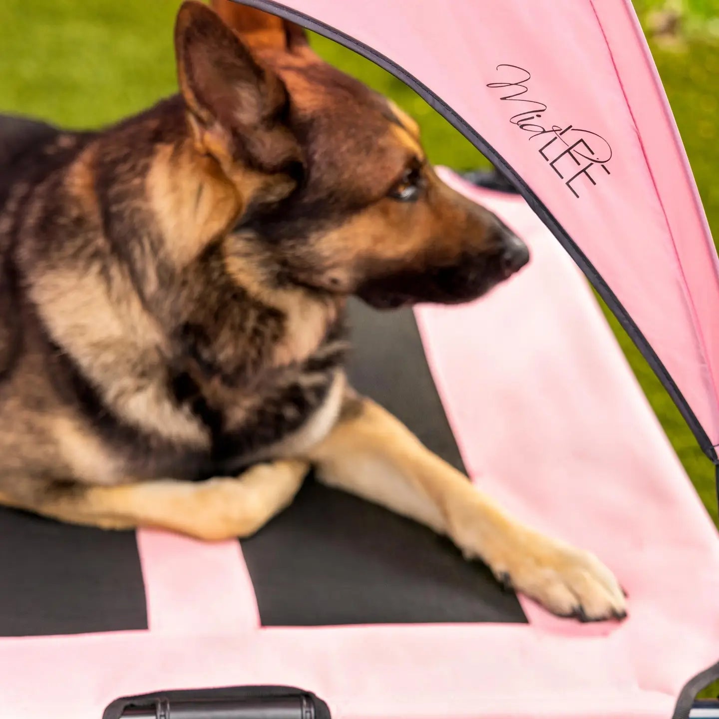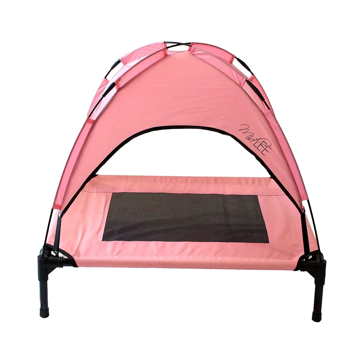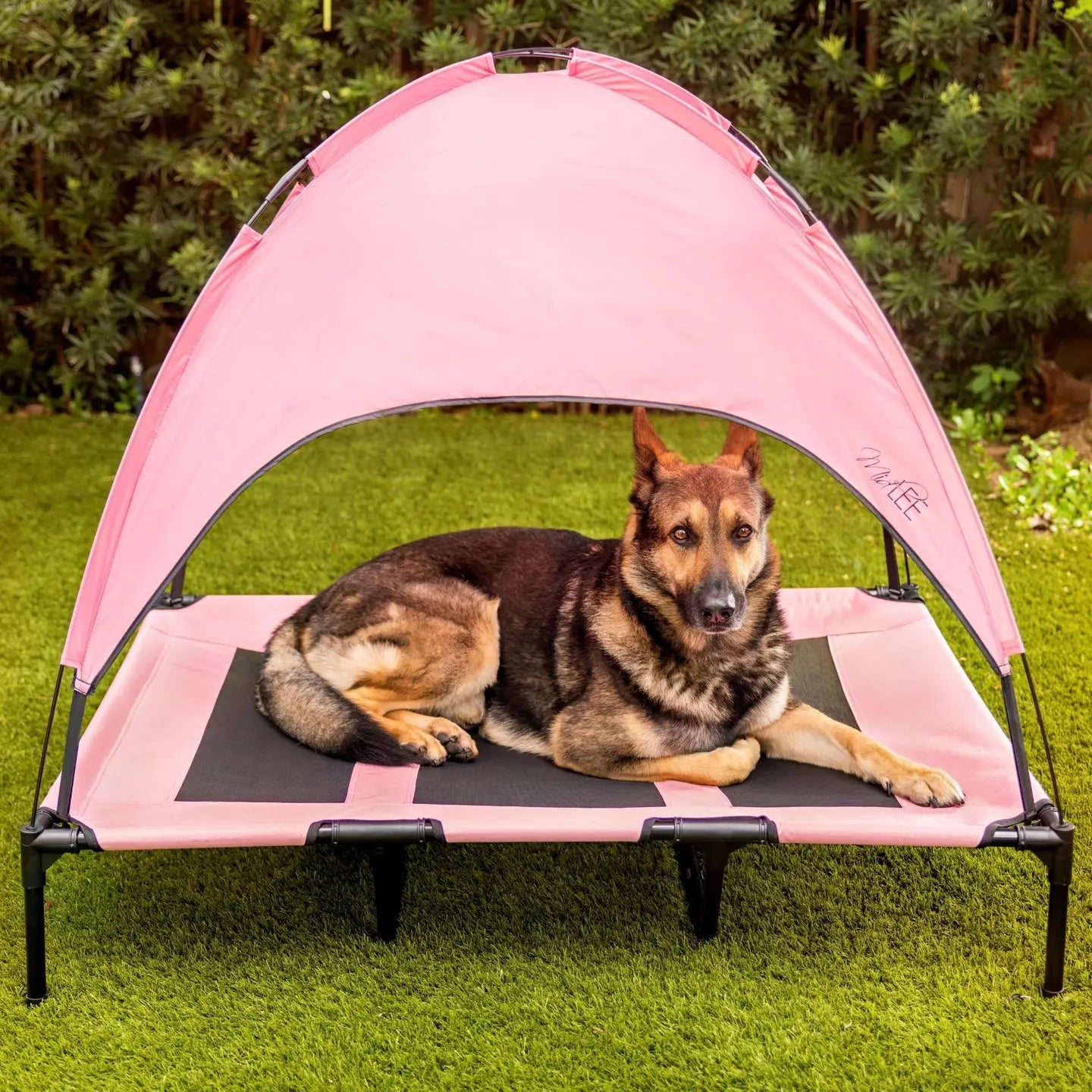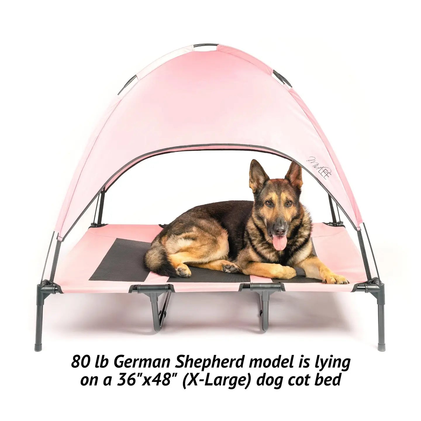 This off-the-ground dog bed with a canopy can be used outdoors to protect your dog from the sun or you can remove the canopy and it becomes a sturdy indoor bed. Keep your dog clean and cool with this sturdy dog cot. The mesh provides cooling ventilation and the canopy provides protection and shade from the sun. It is quick and easy to assemble so you can quickly have this dog cot displayed in your backyard or campsite! Cot image displayed is of the size Large only. We are working to get pictures of the other sizes up ASAP! These cots look just like the green, gray, and salmon cots but are pink :) -