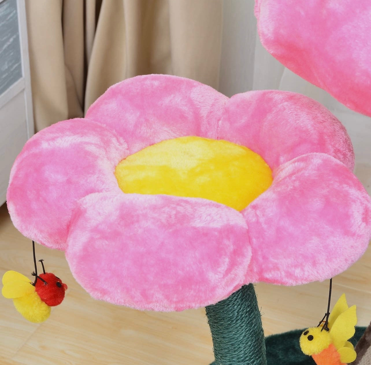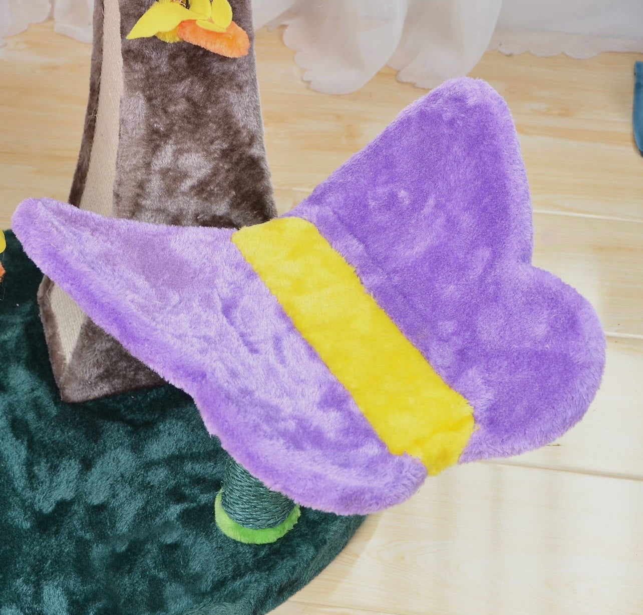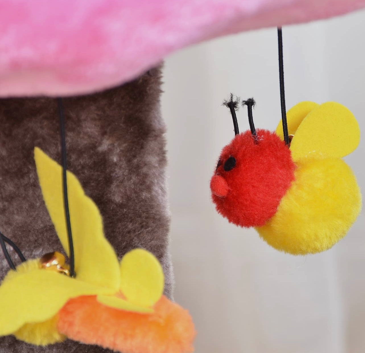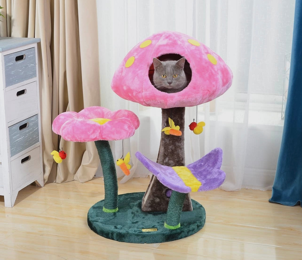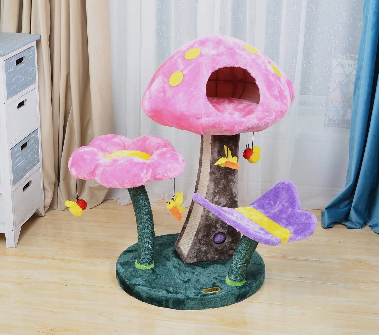 Adorable mushroom and flower perch cat tree features plush multiple platforms, soft butterfly cradles, 100% natural sisal steam scratching post, mushroom condo and hanging toys. The soft plush perches provide optimal comfort for your furry friend. The mushroom condo allows your pet to sleep tucked away in superior comfort. The scratching post and hanging toys provide hours of playtime for your funny felines.