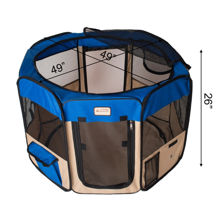 The Armarkat portable playpen can hold one large dog or entire litters of kittens and puppies. Available in a blue and beige color combination, the playpen sets up fast and folds flat to go into its carrier bag. F and B Bullet:. It has a zip-off top and outside pocket for treats and toys. model PP001B is water resistant and is constructed of extra-strong polyester fabric with mesh vents for visibility and air. With a net weight of 7.7 lbs., the portable playpen is lightweight for outside or indoors, but tough enough for travel. Equipped with space for pet care accessories like water bottle holder, water dispensing window, and exterior pocket to keep pet treats like a chewable or toys. Water-resistant material, easy to clean. Easily Set up or flat folded and kept inside a small travel bag or backpack. Great for traveling, riding, walking, sightseeing, camping, hiking and more outdoor activities. Dimensions: 49"(L) x 49"(W) x 24"(H)