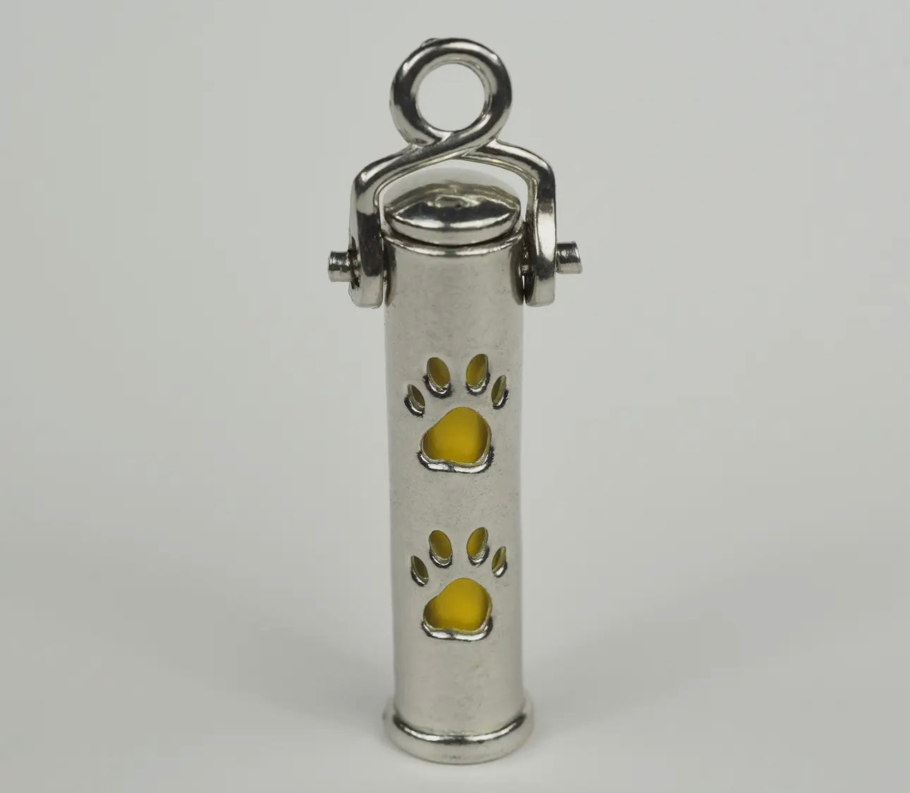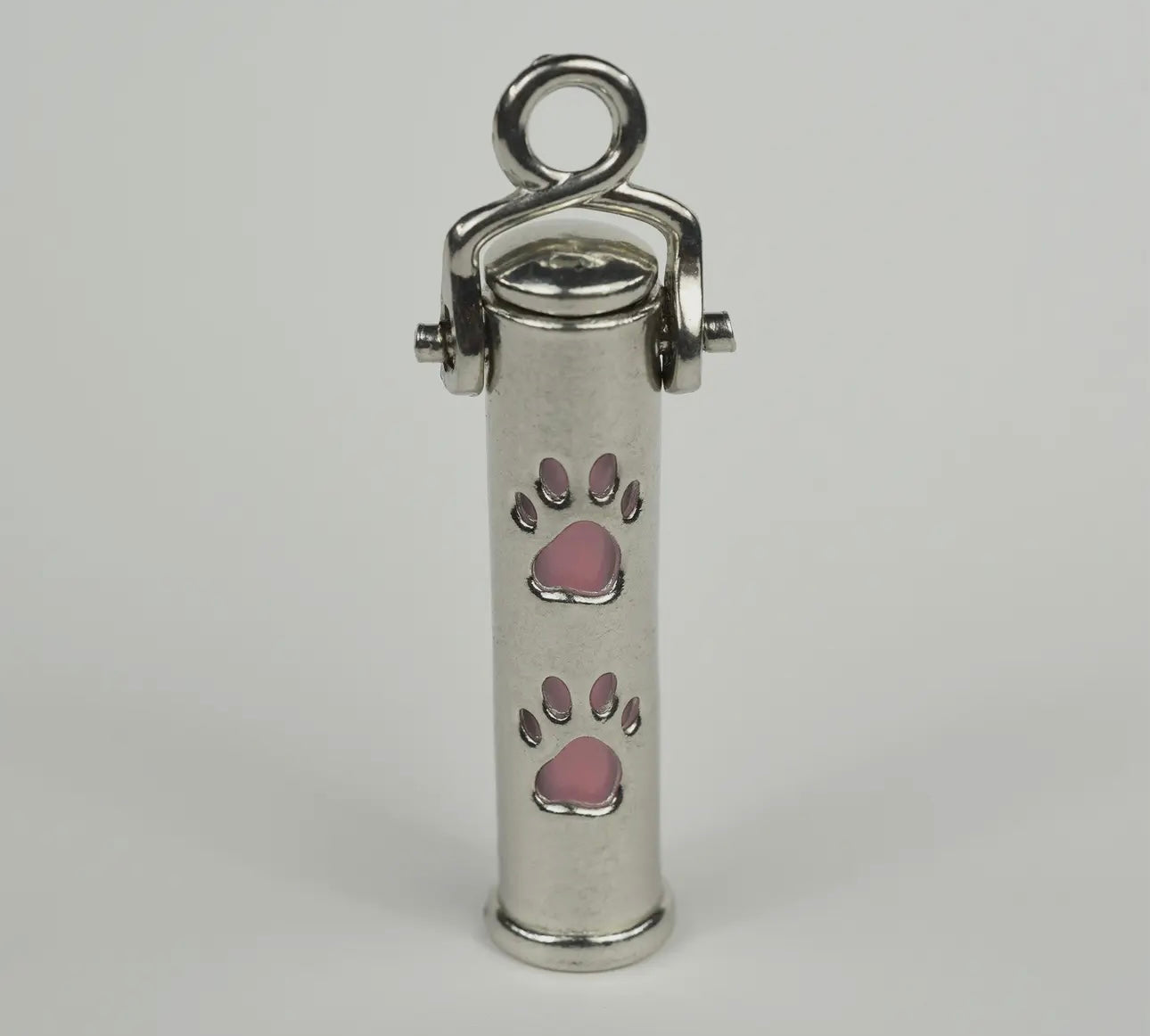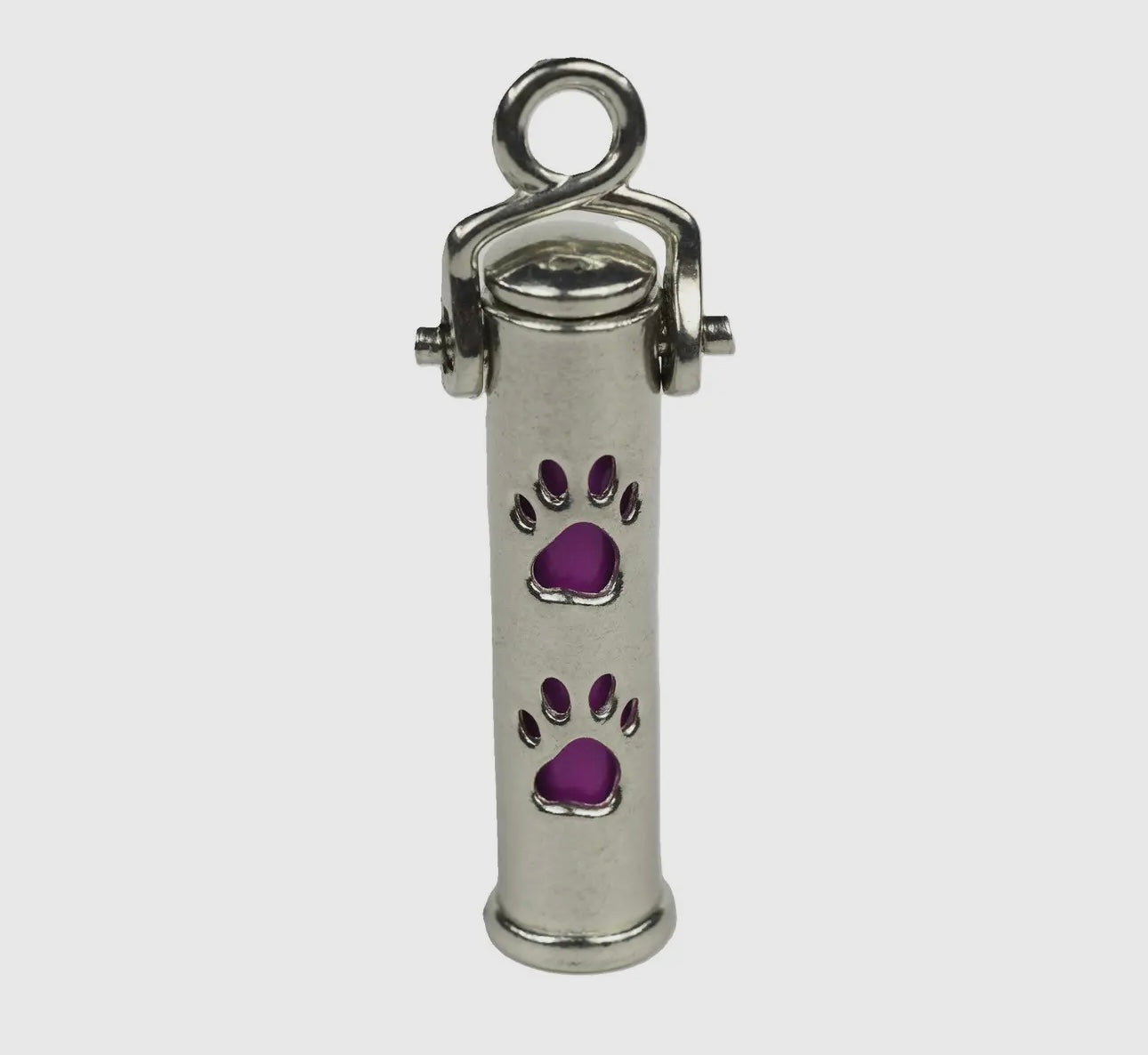 Keep the memory of your beloved furbaby close at heart with this playful design. This key chain urn is perfect keeping a memento of your pet with you at all times. You can have a clear glass vial or choose a colored vial for a more personal touch. Can also be worn as a necklace.