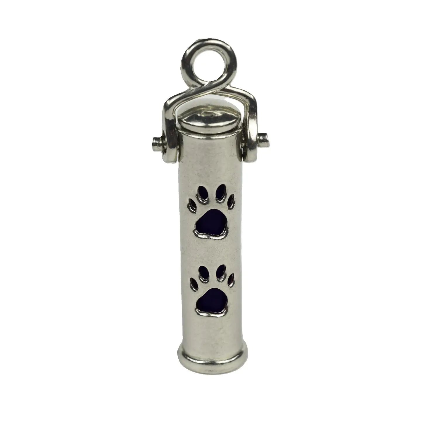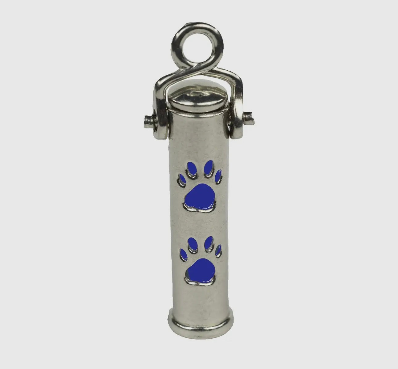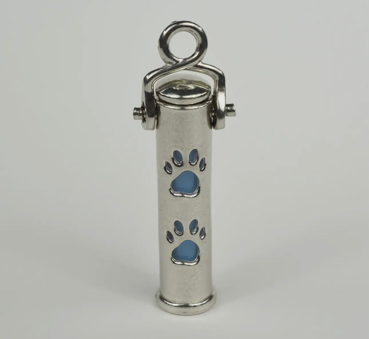 Keep the memory of your beloved furbaby close at heart with this playful design. This key chain urn is perfect keeping a memento of your pet with you at all times. You can have a clear glass vial or choose a colored vial for a more personal touch. Can also be worn as a necklace.