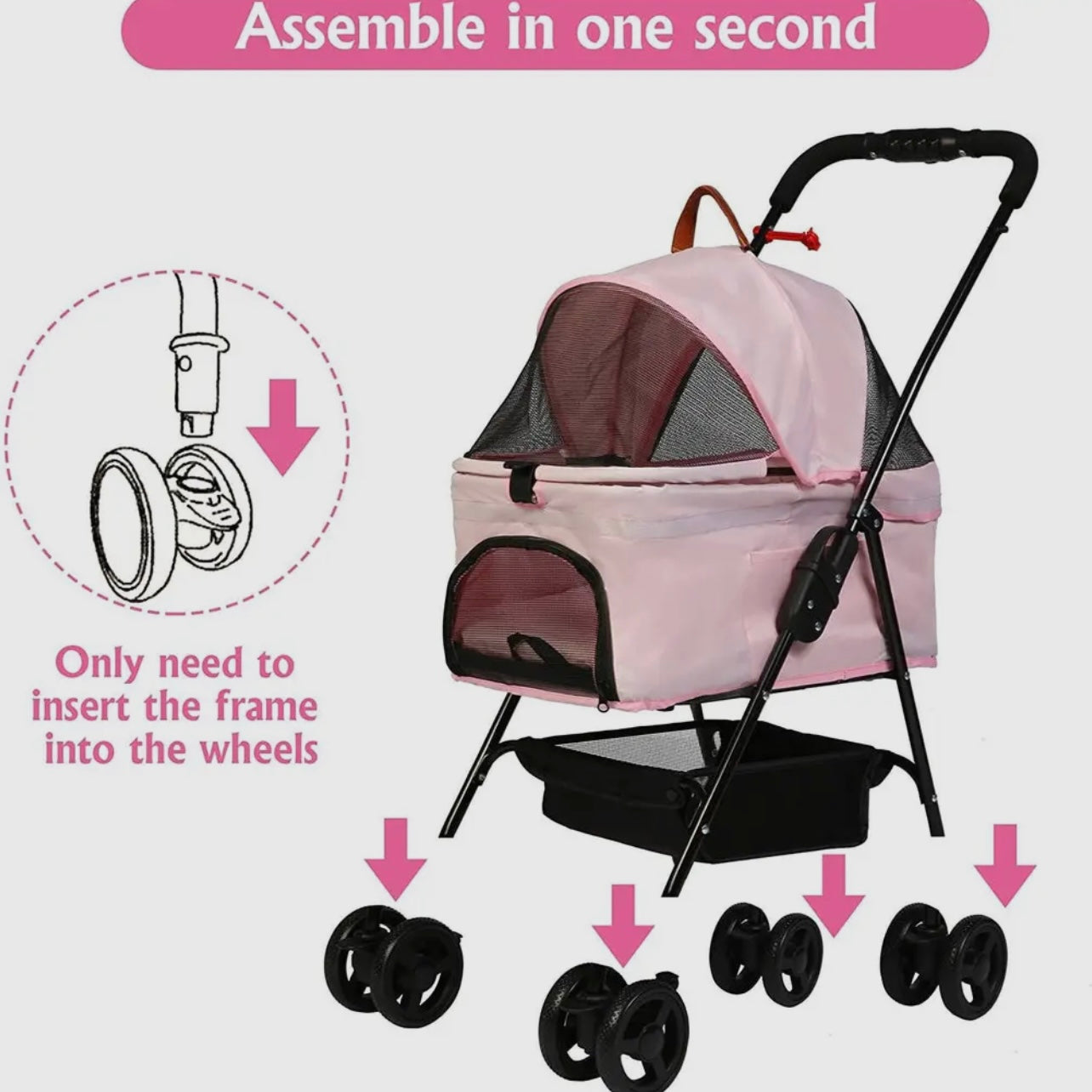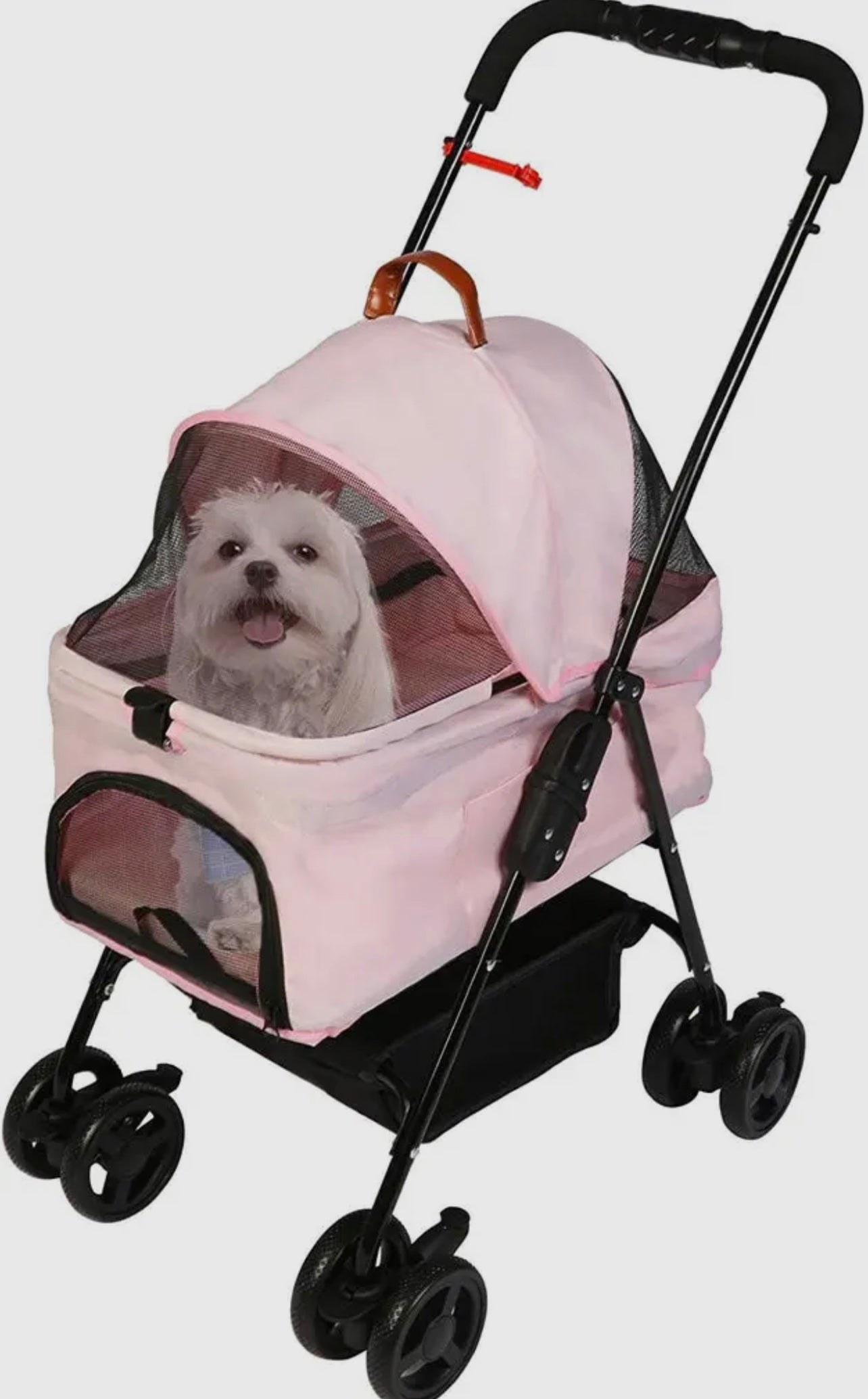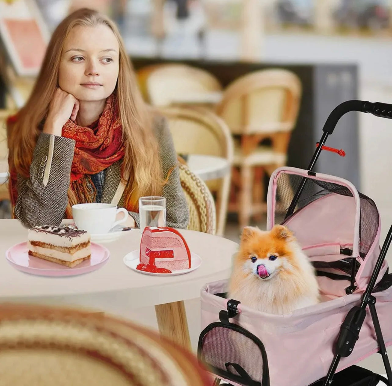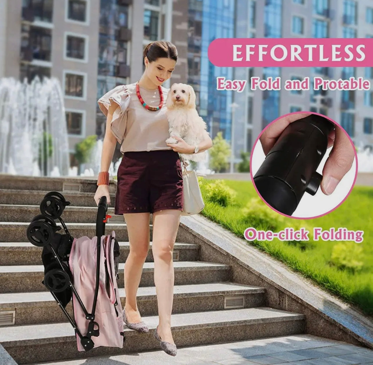 The Pink Folding Pet Stroller is a practical and stylish accessory for pet owners with small to medium-sized dogs and cats. This stroller features a vibrant pink color that adds a cheerful touch to your walks. Designed for convenience, it folds easily for storage and transport. The stroller includes a comfortable, spacious compartment for your pet, complete with a secure enclosure to keep them safe while allowing them to enjoy the scenery. Mesh windows provide ventilation and visibility, while the sturdy wheels ensure smooth and effortless maneuverability. Perfect for city strolls, trips to the park, or running errands, this pet stroller combines functionality with a fun, eye-catching design.