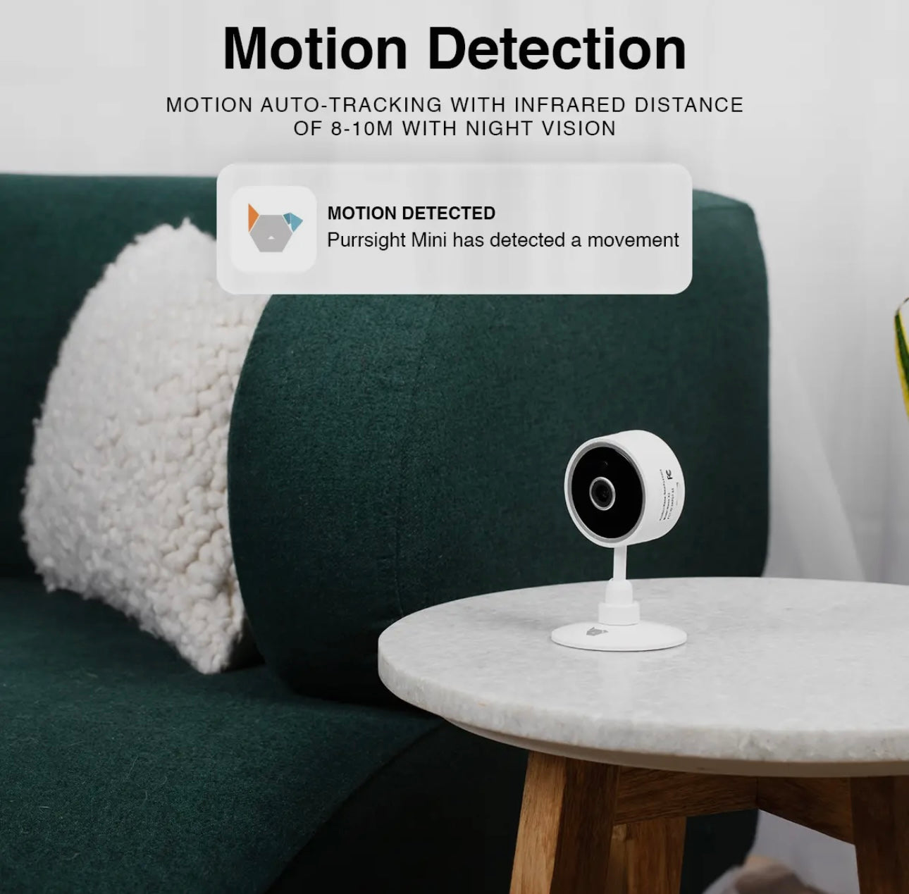 MOTION SENSOR and ALARM NOTIFICATION: The Purrsight Mini HD camera has motion detection feature that notifies you on your phone when activated.