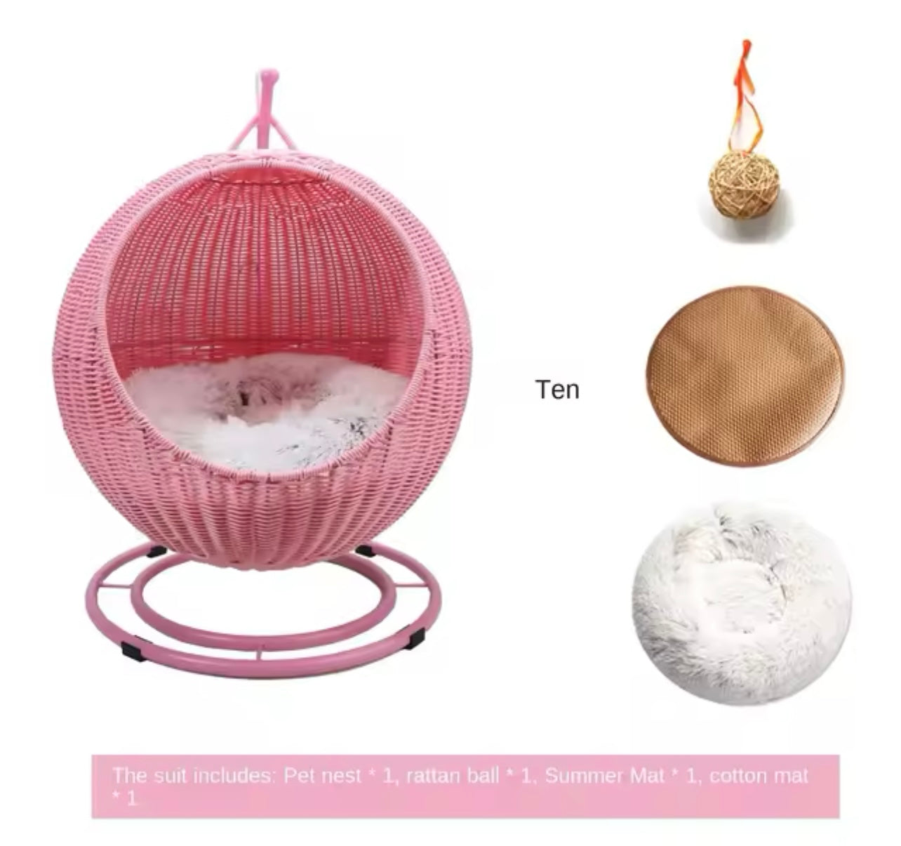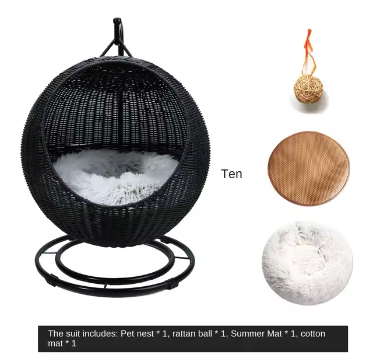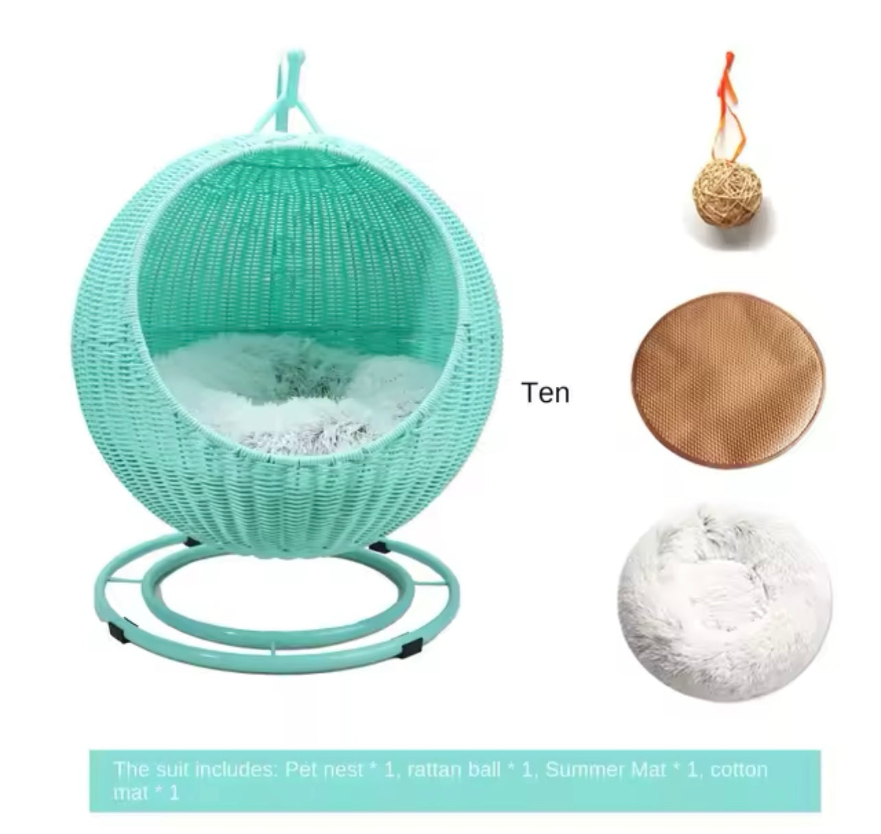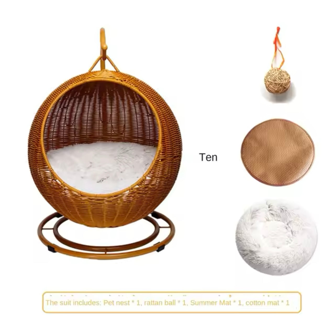 The Rattan Round Hanging Pet Basket Bed is a cozy and stylish resting spot for your pet. Crafted from natural rattan, this hanging basket adds a touch of elegance to any space while providing a comfortable and secure place for your pet to relax. The bed comes with a rattan ball toy that dangles from the basket, offering entertainment and stimulation. It also includes a cool mat for warmer days, ensuring your pet stays comfortable, and a soft mat for added coziness, making it perfect for any season. This versatile bed combines functionality with aesthetic appeal, making it an ideal choice for both you and your pet.