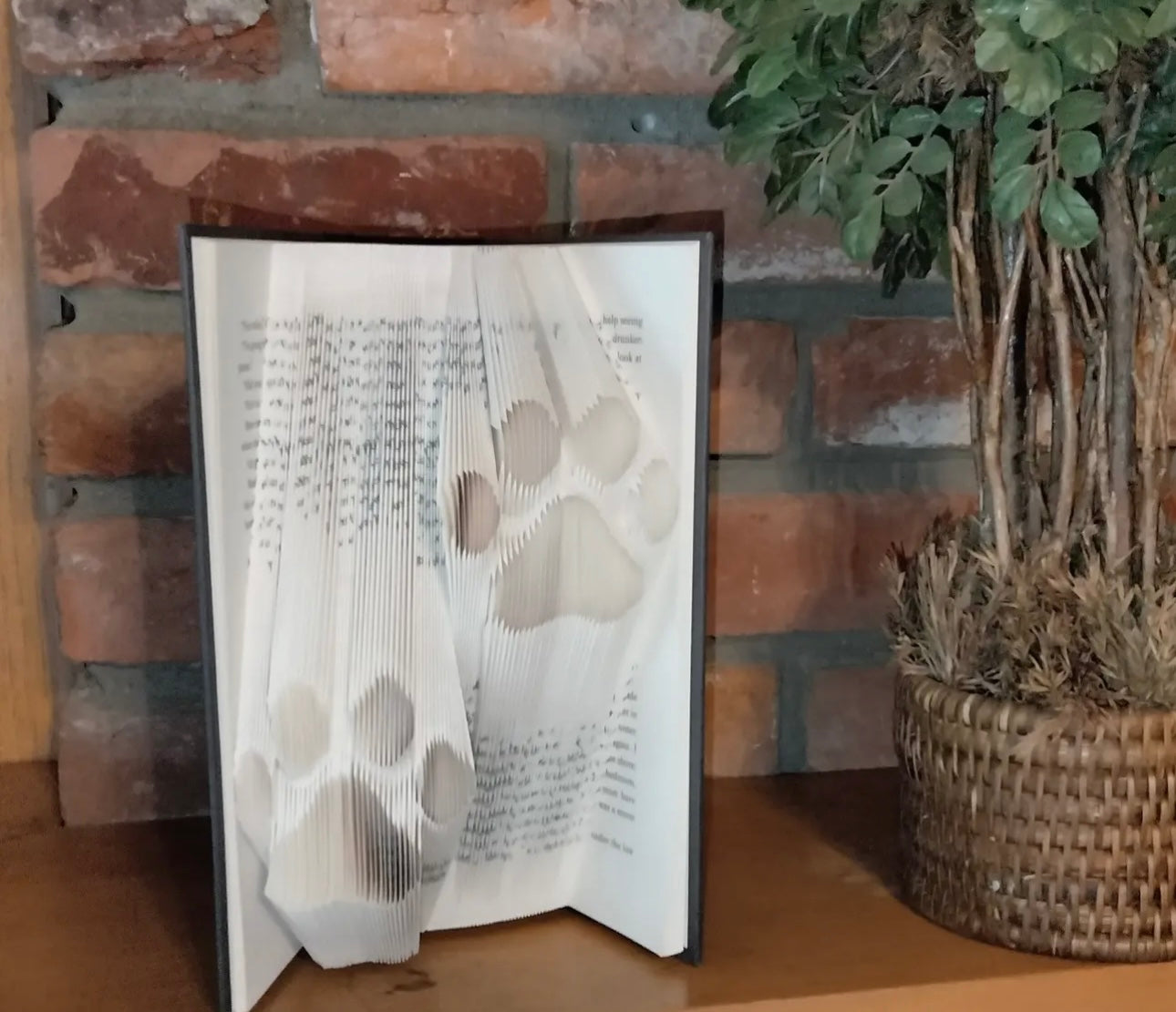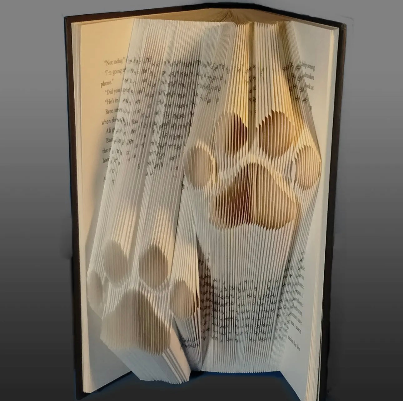 This sculpted paw prints book is a unique piece of book art where the pages are carefully folded to create the illusion of a paw print within the books structure. Each individual fold contributes to the depth and shape of the design, allowing the paw print to emerge three-dimensionally when viewed from the books edge.