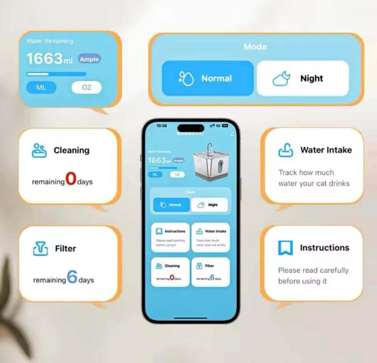 - **App Connectivity:** Control fountain settings, monitor water levels, and track your pet's drinking habits from your smartphone.