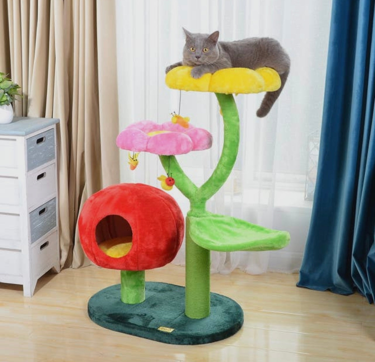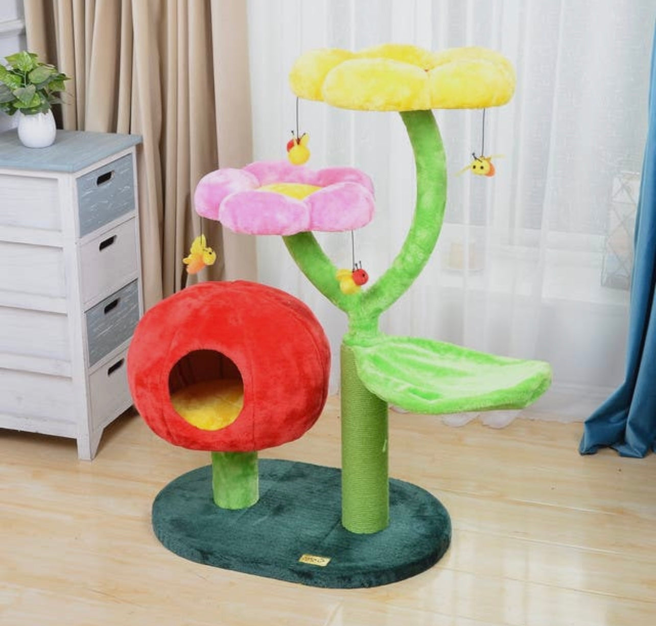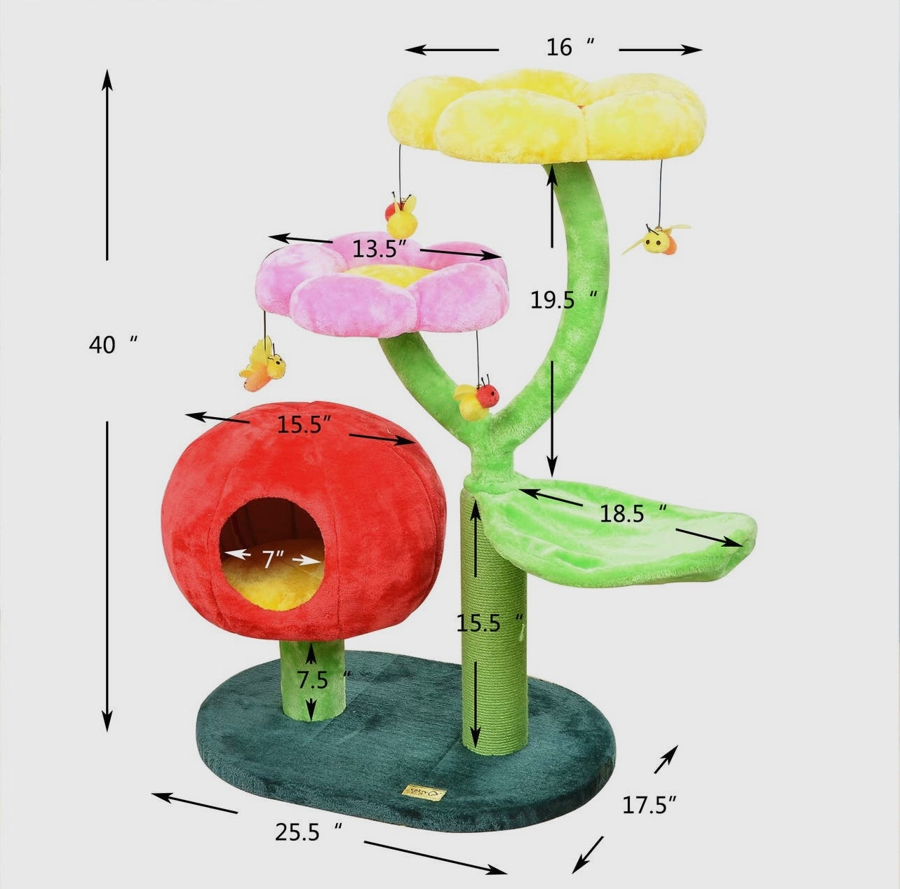 Adorable flower perch cat tree features multiple platforms, leaf cradles, 100% natural sisal steam scratching post, gum drop condo and hanging toys. The soft plush perches provide optimal comfort for your furry friend. The gumdrop condo allows your pet to sleep tucked away in superior comfort. The scratching post and hanging toys provide hours of playtime for your funny felines.