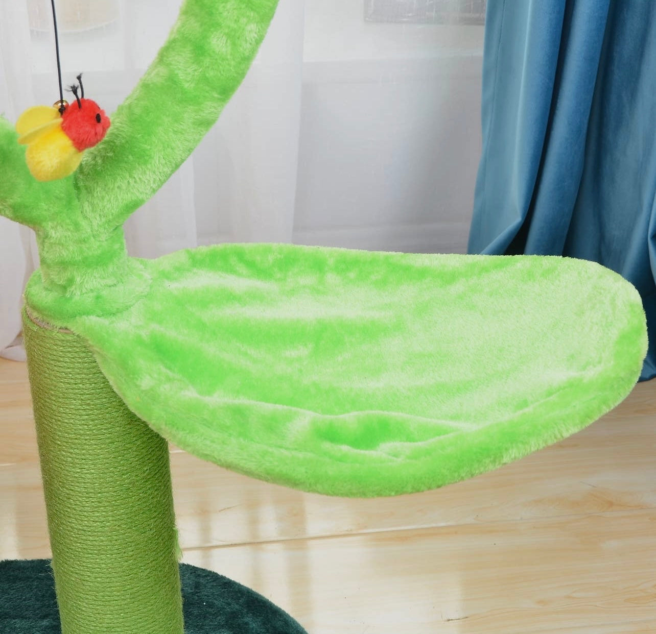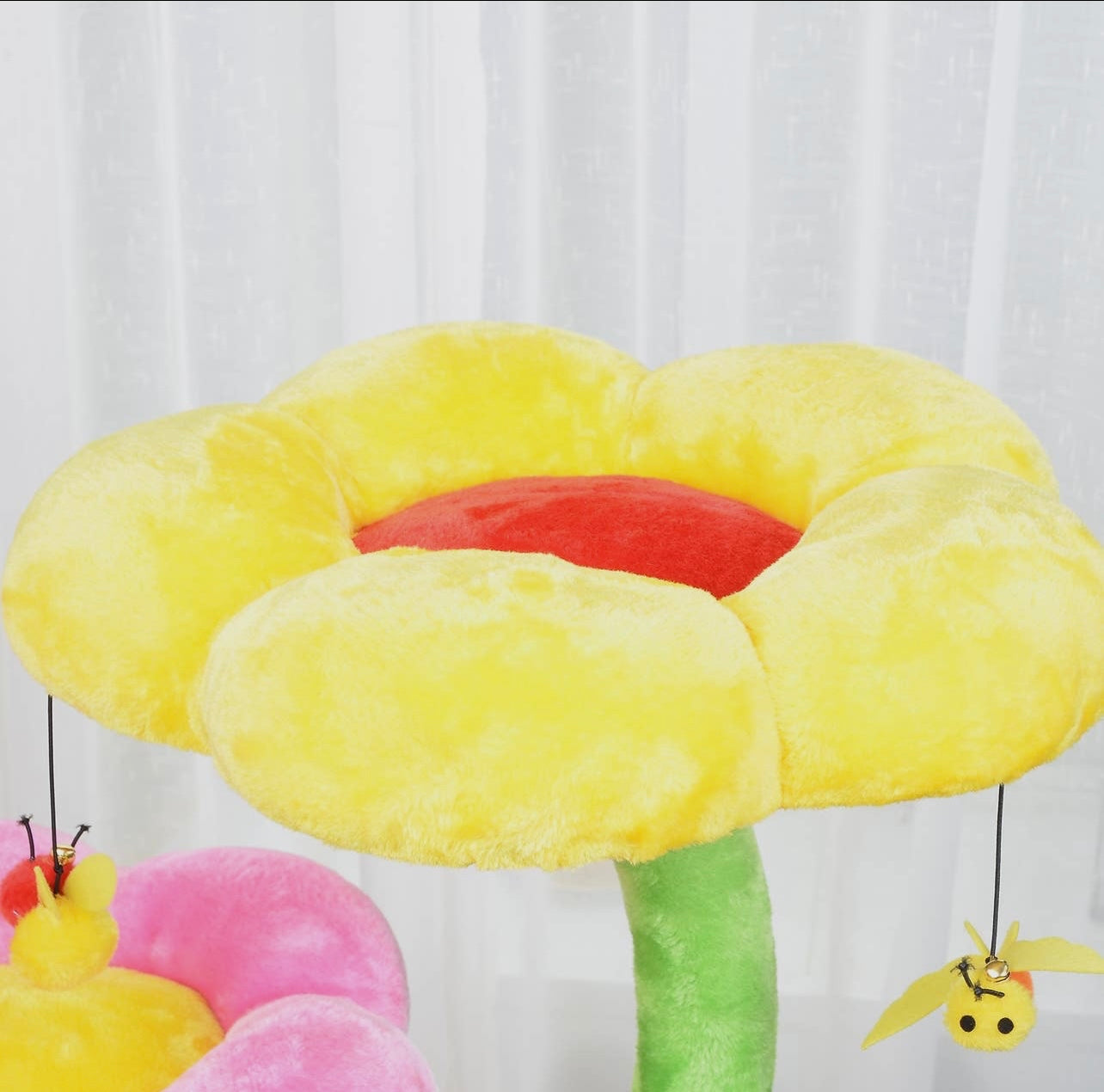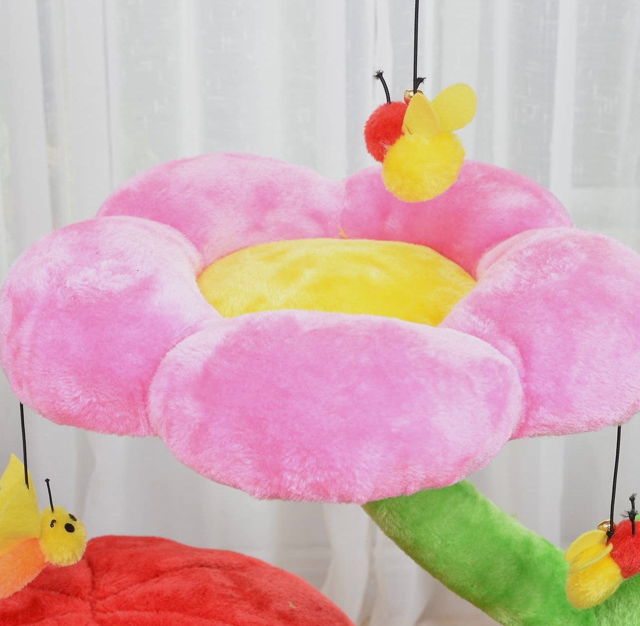 Adorable flower perch cat tree features multiple platforms, leaf cradles, 100% natural sisal steam scratching post, gum drop condo and hanging toys. The soft plush perches provide optimal comfort for your furry friend. The gumdrop condo allows your pet to sleep tucked away in superior comfort. The scratching post and hanging toys provide hours of playtime for your funny felines.